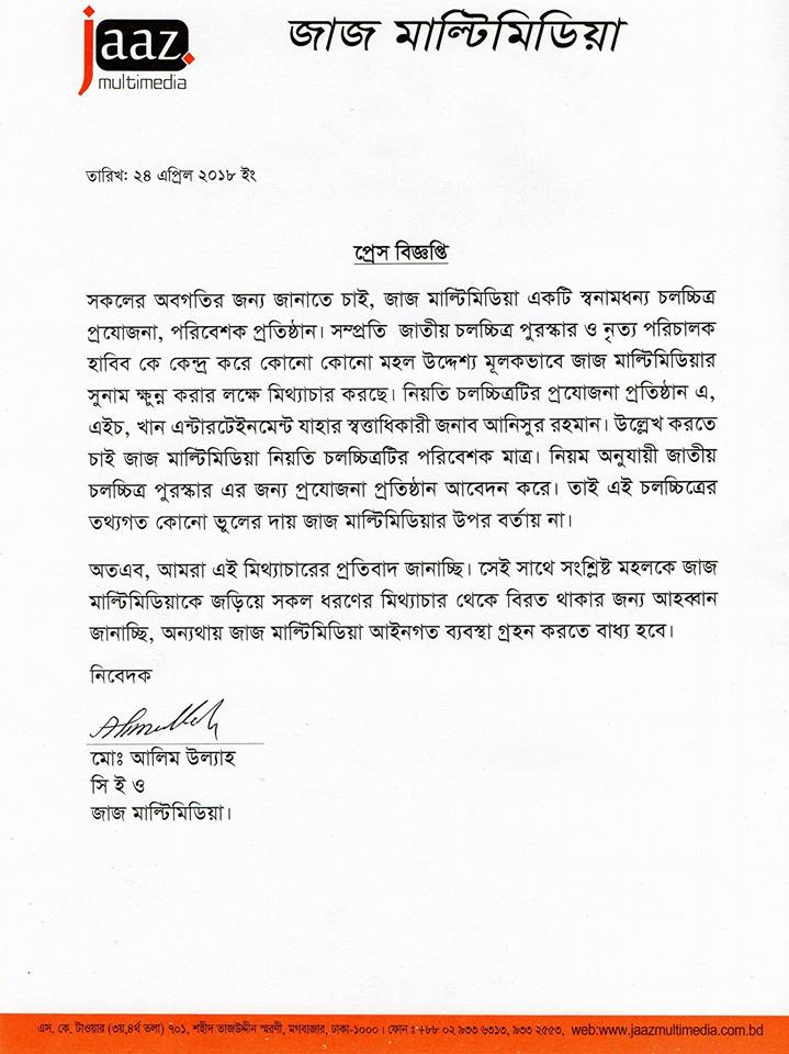 সকলের অবগতির জন্য জানাতে চাই, জাজ মাল্টিমিডিয়া একটি স্বনামধন্য চলচ্চিত্র প্রযোজনা, পরিবেশক প্রতিষ্ঠান। সম্প্রতি জাতীয় চলচ্চিত্র পুরস্কার ও নৃত্য পরিচালক হাবিবকে কেন্দ্র করে কোনো কোনো মহল উদ্দেশ্যমূলকভাবে জাজ মাল্টিমিডিয়ার সুনাম ক্ষুন্ন করার লক্ষে মিথ্যাচার করছে। নিয়তি চলচ্চিত্রটির প্রযোজনা প্রতিষ্ঠান এ, এইচ, খান এন্টারটেইনমেন্ট যাহার স্বত্তাধিকারী জনাব আনিসুর রহমান। উল্লেখ করতে চাই জাজ মাল্টিমিডিয়া নিয়তি চলচ্চিত্রটির পরিবেশক মাত্র। নিয়ম অনুযায়ী জাতীয় চলচ্চিত্র পুরস্কার এর জন্য প্রযোজনা প্রতিষ্ঠান আবেদন করে। তাই এই চলচ্চিত্রের তথ্যগত কোনো ভুলের দায় জাজ মাল্টিমিডিয়ার উপর বর্তায় না।