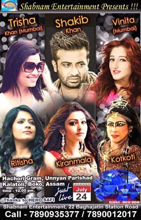 ওই অনুষ্ঠানের পোস্টারে শাকিবের পাশাপাশি আকর্ষণ হিসেবে ছিলেন মুম্বাই থেকে আসা অখ্যাত গায়িকা ও মডেল। আরো ছিলেন কলকাতার সিরিয়ালের জনপ্রিয় চরিত্র কিরণ মালা ও কটকটি।