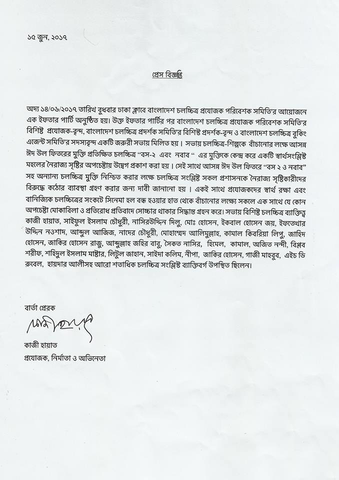 এতে বলা হয়, বুধবার (১৪ জুন) ঢাকা ক্লাবে বাংলাদেশ চলচ্চিত্র প্রযোজক পরিবেশক সমিতির আয়োজনে এক ইফতার পার্টি হয়। ইফতার পার্টির পর বাংলাদেশ চলচ্চিত্র প্রযোজক পরিবেশক সমিতির প্রযোজক, বাংলাদেশ চলচ্চিত্র প্রদর্শক সমিতির প্রদর্শক ও বাংলাদেশ চলচ্চিত্র বুকিং এজেন্ট সমিতির সদস্যরা একটি জরুরি সভায় মিলিত হন। ওই সভায় এই দাবি জানানো হয়।