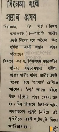 সিরাজগঞ্জ, ৭ই মার্চ (নিজস্ব সংবাদদাতা)। —সম্প্রতি স্থানীয় একটি সিনেমা হলে জনৈকা ভদ্রমহিলা একটি সন্তান প্রসব করিয়াছেন।