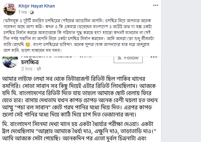 অন্যদিকে মানির স্ট্যাটাসের স্ক্রিনশট শেয়ার করে খিজির হায়াত খান লেখেন, ফেইসবুক এ দুইটি জনপ্রিয় চলচ্চিত্রের পেইজের অ্যাডমিন আপনি। চলচ্চিত্র নিয়ে আপনার অনেক গবেষণা আছে আশা করি। কখন ও কি একবার ভেবেছেন বাংলাদেশ এ আউট অফ দা বক্স একটা চলচ্চিত্র নির্মাণ করতে আমাদেরকে কি পরিমাণ যুদ্ধ করতে হয়? হয়তো কখনই জানবেন না সেই দিন পর্যন্ত যতদিন না আপনি নিজে একটা চলচ্চিত্র নির্মাণ করবেন। আমি আমরা তো শুধু জীবনটা বাজি রেখেছি । বাংলা চলচ্চিত্রের ভবিষ্যৎ অনেক সুন্দর হোক আপনাদের হাত ধরে আব্দুল্লাহ আল মানি, ভালো থাকবেন সব সময়।