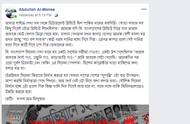 আবদুল্লাহ আল মানি লেখেন, আমার লাইফে লেখা সব থেকে ডিটারজেন্ট রিভিউ ছিল শাকিব খানের বসগিরি। সোডা সাবান সব কিছু দিয়েই এটার রিভিউ লিখেছিলাম। আজকে যদি মি. বাংলাদেশের রিভিউ দিতে যায় তাহলে আমাকে ছোট বেলায় ফিরে যেতে হবে। বাসায় দেখতাম যখন কাপড় চোপড় অনেক বেশী ময়লা হত তখন আম্মু “পচা বল সাবান” কেটে গরম পানির মধ্যে দিয়ে দিত। এরপর কাপড় গুলো সেই পানির মধ্যে দিয়ে কাঠি দিয়ে চাপ দিত ভেজানোর জন্য।