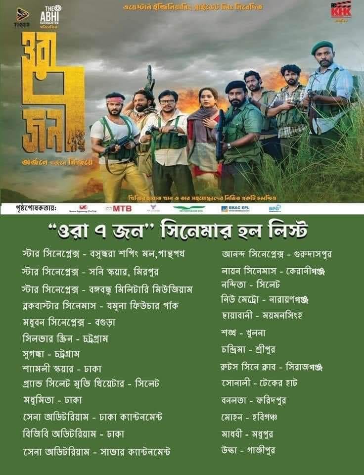 স্বাধীনতার মাসের প্রথম শুক্রবারে মুক্তি পাচ্ছে ছবিটি খিজির হায়াত খানর ‘ওরা ৭ জন’। প্রথম সপ্তাহে সিনেমাটি পাচ্ছে ২৬টি প্রেক্ষাগৃহ।