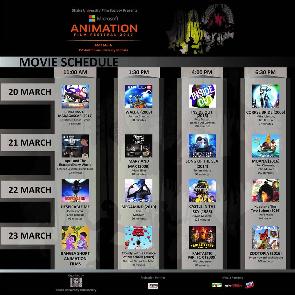 ২২ মার্চ ২০১৭ বুধবার সকাল ১১টায় ‘ডেসপিকেবল মি’, বেলা ১টা ৩০ মিনিটে ‘মেগামাইন্ড’, বিকেল সাড়ে ৪টায় ‘ক্যাসল ইন দ্য স্কাই’ ও সন্ধ্যা সাড়ে ৬টায় ‘কুবো অ্যান্ড দ্য টু স্ট্রিংস’ এবং ২৩ মার্চ ২০১৭ বৃহস্পতিবার সকাল ১১টায় কয়েকটি বাংলা স্বল্পদৈর্ঘ্য অ্যানিমেটেড ছবি, বেলা ১টা ৩০ মিনিটে ‘ক্লাউডি উইথ এ চান্স অব মিটবলস’, বিকেল সাড়ে ৪টায় ‘ফ্যান্টাস্টিক মিস্টার ফক্স’ ও সন্ধ্যা য়াসাড়ে ৬টায় ‘জুটোপিয়া’ প্রদর্শন করা হবে।