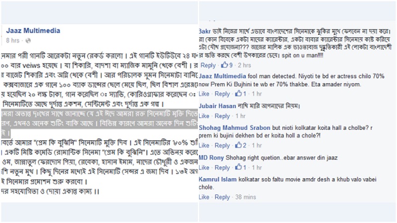 ওই পোস্টে আবু বকর নামে একজন মন্তব্য করেন— ‘ভাই নিজের স্বার্থে এভাবে বাংলাদেশের সিনেমাকে ঝুঁকির মুখে ফেলবেন না দয়া করে। আপনারা কোন বিবেকে একটা মায়ের ক্যারেক্টার, একটা বাবার ক্যারেক্টার সিনেমায় কাস্ট করিয়ে বলেন এটা যৌথ প্রযোজনা? জাজের মালিক এক ভাওতাবাজ দুষ্কৃতিকারী এই লোকটা বাংলাদেশী সিনেমার ক্ষতি করছে বেশি উপকারের চেয়ে।’