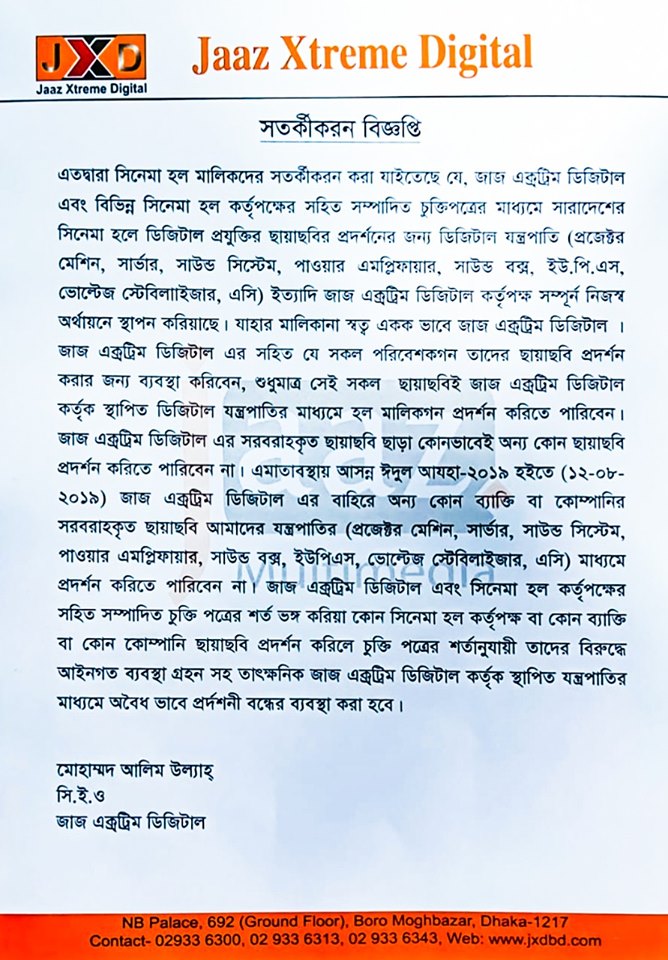 সম্প্রতি জাজের পক্ষ থেকে সিনেমা হল মালিকদের সতর্ক করে দিয়ে সোশ্যাল মিডিয়ায় একটি বিজ্ঞপ্তি প্রকাশ করা হয়। সেখানে বলা হয় চুক্তিপত্রের মাধ্যমে সারাদেশের সিনেমা হলে ডিজিটাল সরঞ্জামে অর্থায়ন করেছেন প্রতিষ্ঠানটি।