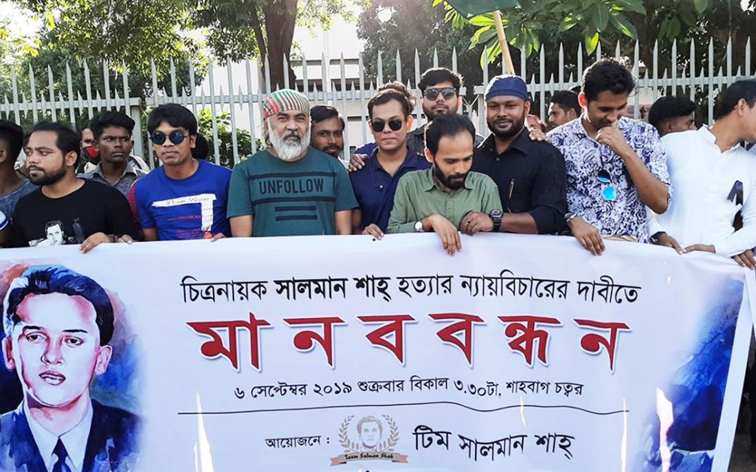 মানববন্ধনে ভক্তরা সালমান শাহের হত্যাকারীদের বিচারের আওতায় এনে ফাঁসির দাবি জানান।