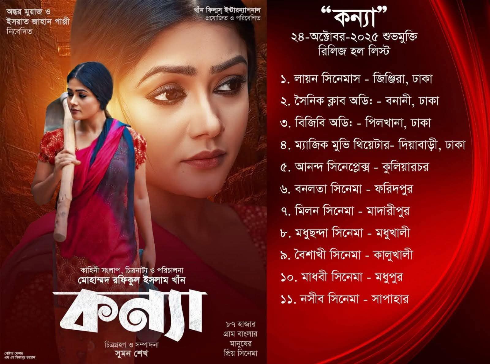 পরিবারের হাল ধরা এক তরুণীর সংগ্রামের গল্পে নির্মিত চলচ্চিত্র ‘কন্যা’ ২৪ অক্টোবর শুক্রবার দেশের ১১টি প্রেক্ষাগৃহে মুক্তি পেয়েছে। চলচ্চিত্রটি পরিচালনা করেছেন মোহাম্মদ রফিকুল ইসলাম খাঁন।